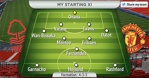 预测曼联对森林首发:奥纳纳/万比萨卡,瓦拉内,埃文斯,迪奥古·达洛/科比·梅诺,埃里克森,布鲁诺·费尔南德斯/加纳乔,霍伊伦德,拉什福德。