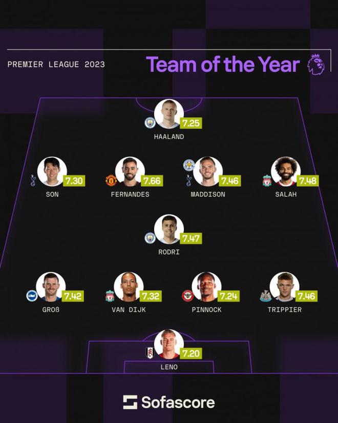 JRS直播网12月30日讯 Sofascore根据球员评分列出了2023年英超最佳阵容,B费当选最佳球员 哈兰德、孙兴慜入选。