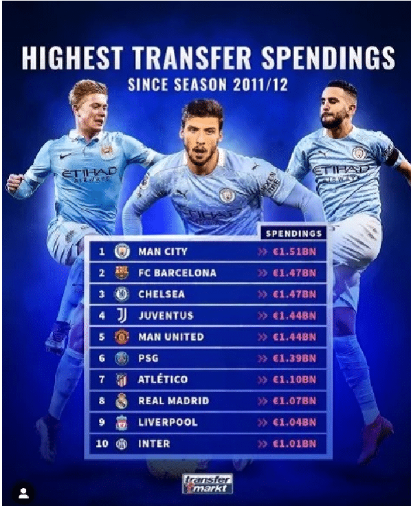 而第三的是切尔西,他们呀花费了14.7亿欧元,而切尔西虽然花费不少,但是最近这些年买人也不少。第四的是尤文,尤文引援花费了14.4亿欧元,尤文花费的钱也不少,不过他们前期在转会市场上的投入还是很成功的,最近几年只能说一般。随后是曼联,他们也花费了14.4亿欧元,曼联的转会,有好有坏,而球队的成绩也只能说是一般。再往后是巴黎的13.9亿欧元,马竞的11亿欧元,皇马的10.7亿欧元,利物浦的10.4亿欧元和国米的10.1亿欧元。