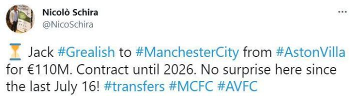 斯基拉表示,曼城将以1.1亿欧元的转会费从维拉签下格拉利什,双方将签约至2026年。