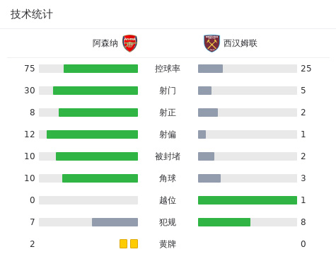 最终全场比赛结束,阿森纳0-2西汉姆。