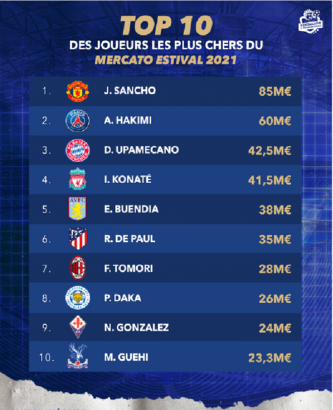 曼联签下了多特球员桑乔,花费了8500万欧元,这是今夏发生的转会中最贵的一笔交易。随后是巴黎,他们花费了6000万欧元从国米签下了阿什拉夫。而第三的是拜仁花费了4250万欧元签下了于帕梅卡诺。而第四的是利物浦花费了4000万欧元从莱比锡签下了科内特。第五是维拉,他们花费了3800万欧元,签下了布恩迪亚。随后是马竞花费了3500万欧元签下了德保罗,跟着是米兰花费2800万欧元签下了托莫里,然后是莱斯特了2600万签下了达卡,第九的是佛罗伦萨花费了2400万欧元签下了冈萨雷斯,第十的是水晶宫花费2330万欧元签下了格伊。