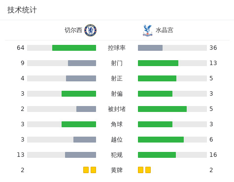 第46分钟,水晶宫扳平比分!左路传到禁区后点奥利斯胸部停球后抽射破门,切尔西1-1水晶宫。