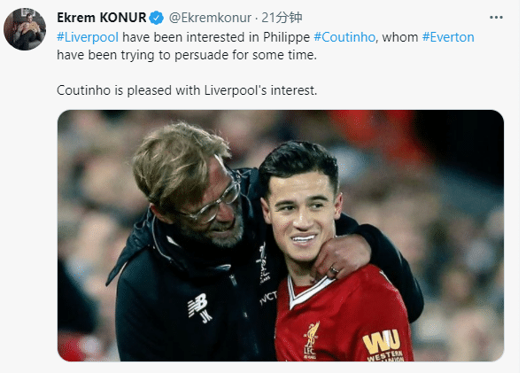 库鸟在2018年1月1.38亿欧元加盟巴萨,但现在成了巴萨的清洗对象。该记者称,利物浦和德比对手埃弗顿都对库鸟感兴趣,而老东家的兴趣让他感到高兴。