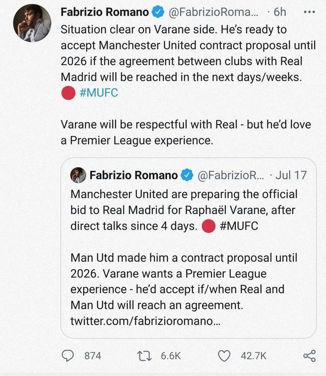 罗马诺在推特上表示:“瓦拉内这边的情况很清晰了,如果曼联和皇马能在未来几天或几周达成一致,他就准备接受曼联开出的合同,合同期限到2026年。瓦拉内对皇马充满尊重,但他想要拥有一段英超经历。”