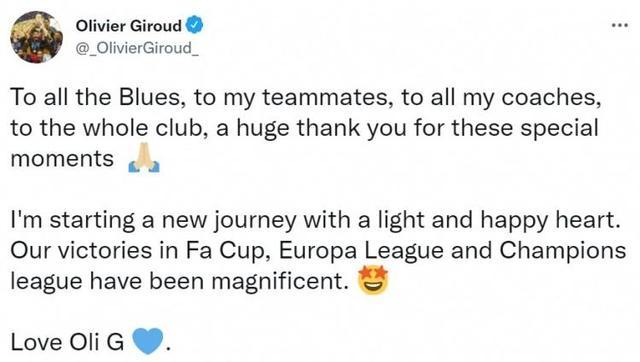 吉鲁写道:“就这些年经历的特殊时刻,向所有的蓝军球迷、队友、我的所有教练以及整个俱乐部表示由衷感谢。我将怀着一颗轻松愉快的心情开启一段新旅程,我们在足总杯、欧联杯以及欧冠的胜利太棒了。”