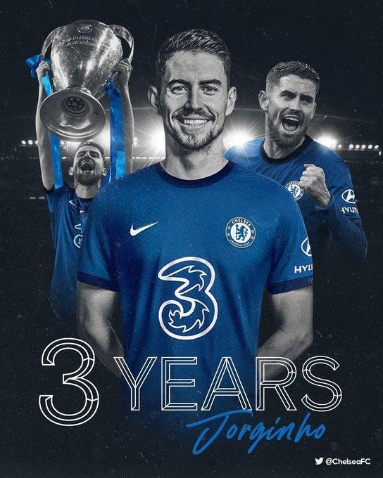 切尔西官方晒出了为若日尼奥制作的海报并配文道:“三年前的今天,我们签下了若日尼奥!”