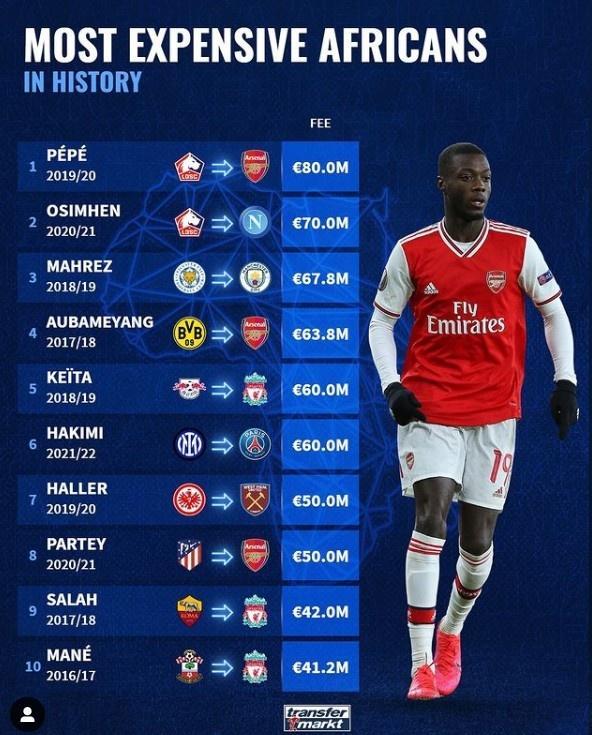 JRS直播网讯 今日,《转会市场》列出了非洲球员转会费榜单,其中马内排在第十,而阿森纳的N-佩佩以8000万欧领跑。