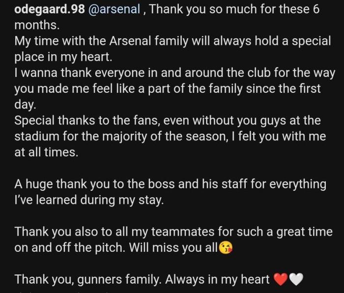 JRS直播网讯北京时间7月4日,厄德高结束了阿森纳租借生涯,挪威人在Ins上发文告别阿森纳。