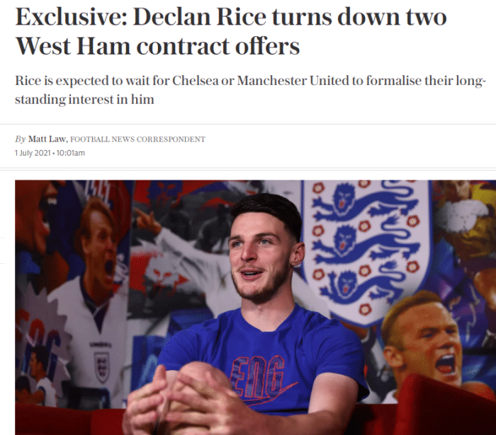 赖斯14岁时离开切尔西青训营,图赫尔很欣赏他,曼城也对他有意。西汉姆为他标价1亿英镑左右。赖斯当初免费加盟西汉姆,如果铁锤拒绝6000万英镑的报价,他会表示不满和失望。