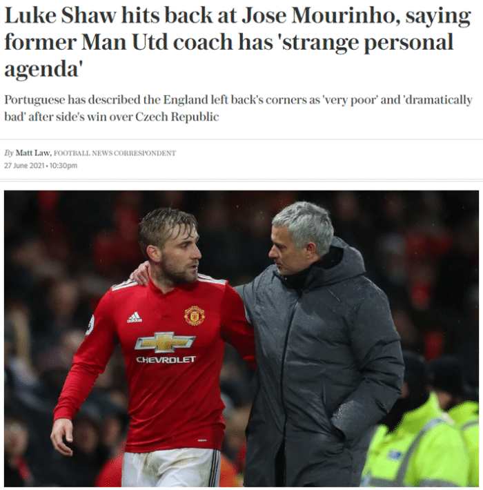 穆里尼奥与卢克-肖曾在曼联有过合作,但两人关系糟糕,期间穆里尼奥多次公开批评这名英格兰边后卫。而在穆里尼奥被曼联解雇后,他又多次公开谈论卢克-肖,本届欧洲杯担任talkSPORT电台评论员,这位葡萄牙教练又数次批评这名球员,称自己会选择奇尔维尔担任英格兰的首发左后卫,而不是卢克-肖,并表示卢克-肖在对阵捷克的比赛中开的角球“糟糕得可笑”。