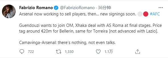 JRS直播网讯 阿森纳目前正在出售球员,以筹集资金引援。他们为托雷拉和贝莱林都标价2000万。扎卡加盟罗马的转会谈判已进入最后阶段,托雷拉和拉齐奥的谈判没有太大进展,而贡多齐想加盟马赛。至于卡马文加,阿森纳并没有开启谈判。