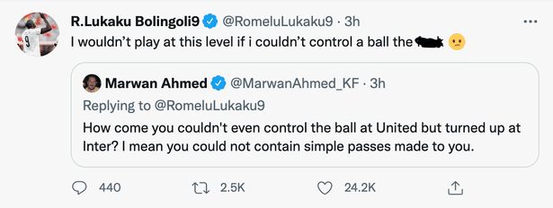 一位昵称「MarwanAhmed_KF」的球迷语气不善地质问卢卡库:「你在曼联时连停球都不会,怎么到了国米这么厉害?我的意思是,你连队友简单的传球都停不住。」