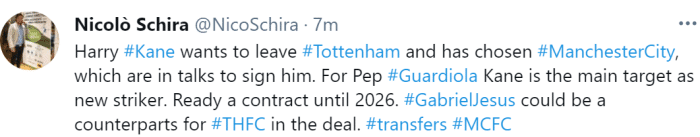 凯恩此前已经明确表示自己在今夏离开热刺,斯基拉透露,这名英格兰队长已经决定前往曼城踢球。