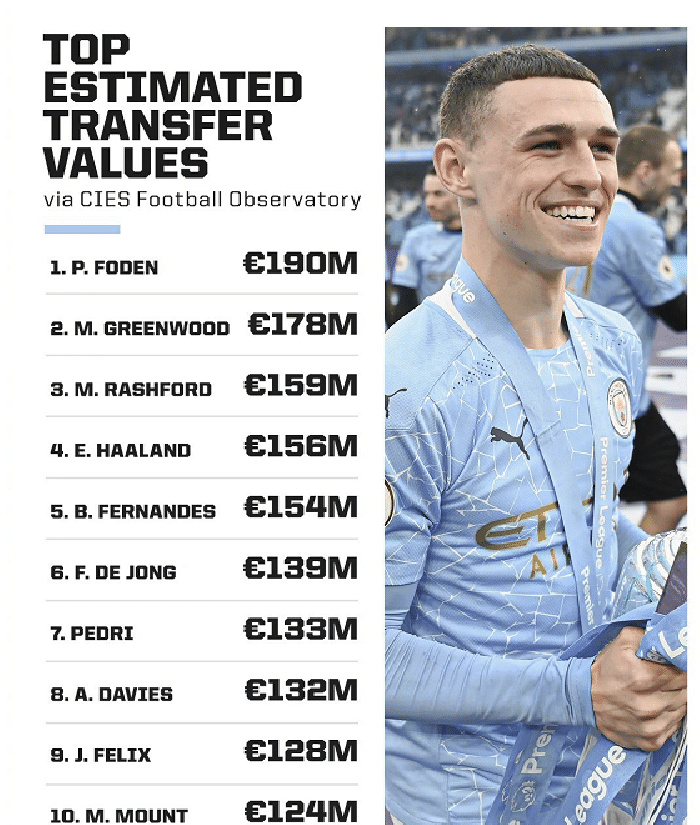如图,足球天文台给出的数据是,预估身价最高的是曼城的福登,预估身价是1.9亿欧元,毕竟福登刚刚拿到了英超官方和英格兰职业工会给出的最佳年轻球员的殊荣,看好他的未来,不过这个身价似乎有点离谱。而排名第二的是曼联队内的拉什福德,他的预估身价是1.78亿欧元,拉什福德本赛季的确表现不错,不过1.78亿,估计真没人要。而第三的是曼联前锋格林伍德,他的预估身价是1.59亿欧元,这个价格有点高了哦。