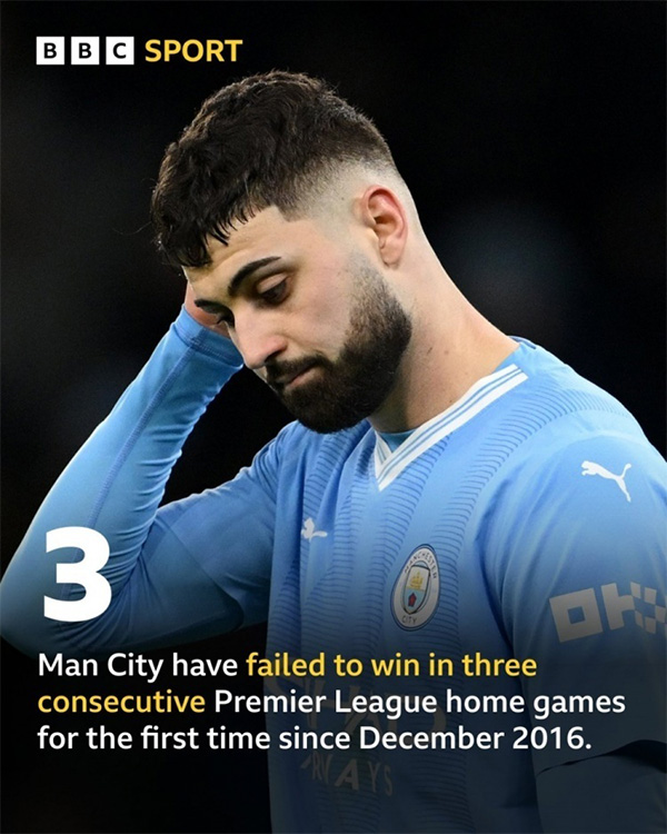 在本轮战平后,曼城最近6轮联赛仅仅取得了1胜4平1负,唯一击败的对手还是升班马卢顿。而且过去6轮,曼城场场丢球,上次在联赛零封已经要追溯到曼市德比3-0击败曼联的比赛中。更令曼城球迷失望的是,曼城目前已经主场3连平,上一次遭遇英超主场3轮不胜还是2016年年底。