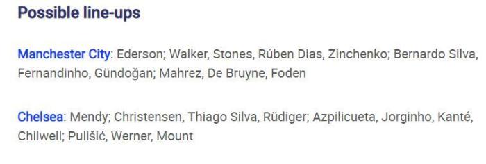 欧足联认为,门迪和坎特已经由图赫尔确认可以出场,阵型方面他们依然会选择三中卫;曼城方面,坎塞洛&罗德里与津琴科&费尔南迪尼奥组合的选择上可能会存在变数,前者更具攻击性,后者防守更稳健。