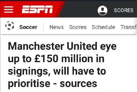 JRS直播网讯 北京时间5月29日,据ESPN消息,曼联今夏准备净投入1-1.5亿英镑来进行引援。