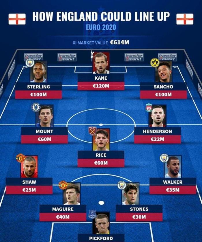 JRS直播网讯 德国转会市场网站评选了英格兰队在本届欧洲杯上可能的首发阵容,头号球星凯恩领衔。