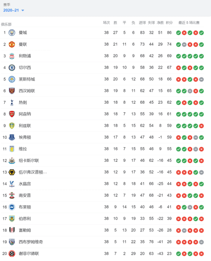 JRS直播网讯 今天凌晨,2020-21赛季英超联赛正式落下帷幕,以下为本赛季英超联赛排名状况及欧战参赛状况。