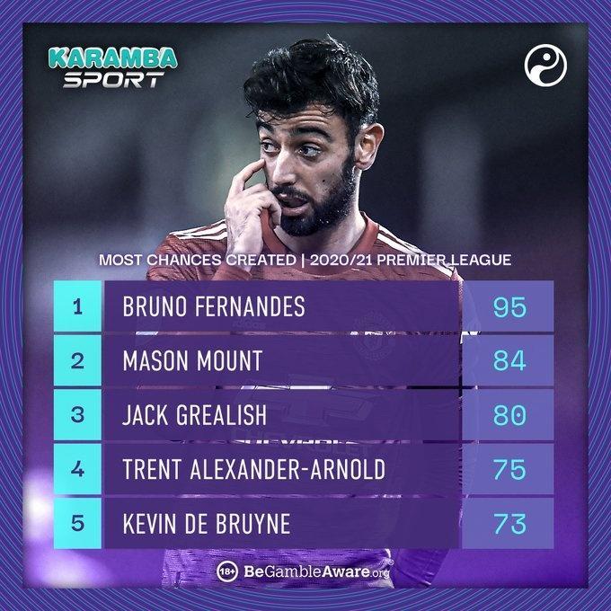 JRS直播网讯 北京时间5月21日,本赛季英超即将结束。据Squawka统计,本赛季英超球员中创造机会最多的是曼联的B费,高达95次。芒特、格拉利什分居第二第三。
