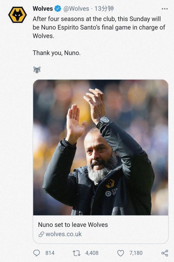 JRS直播网讯 努诺此前曾执教过瓦伦西亚、波尔图等俱乐部。2017年7月1日担任狼队主教练,在此期间,努诺率队重返英超,并取得了英超第七的好成绩。