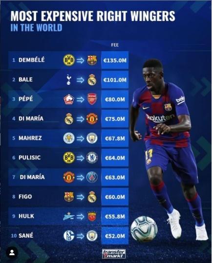 JRS直播网讯 ,德转列出了足坛右边锋转会费排行榜。登贝莱1.35亿欧高居居首,贝尔、佩佩分居第二第三。