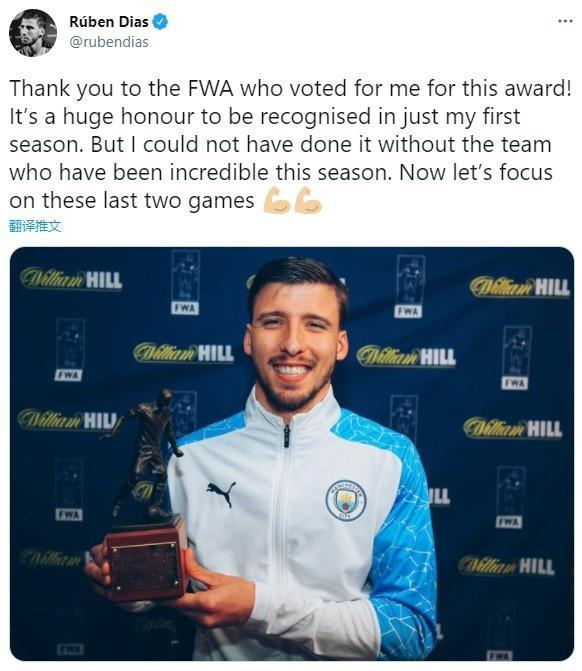 JRS直播网讯 北京时间今天,曼城后卫鲁本-迪亚斯当选英格兰足球记者协会(FWA)评选的英超最佳球员,随后迪亚斯在推特上表达了自己的感想。