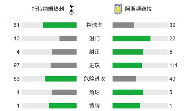 全场比赛结束,热刺1-2阿斯顿维拉。