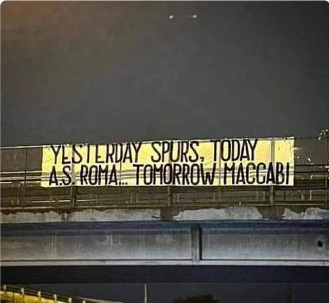 根据英国《镜报》的报道,一部分拉齐奥的球迷比赛前在罗马城北部的一条高速公路边上拉起了一块横幅,标语上写道:“昨天热刺,今天罗马,明天马卡比”