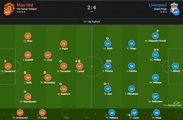 利物浦首发:1-阿利森5.4、66-阿诺德8.2、46-R-威廉姆斯6.5、47-菲利普斯7.7、26-罗伯逊6.4、3-法比尼奥7.0、5-维纳尔杜姆6.3、6-蒂亚戈7.1、20-若塔7.9、11-萨拉赫7.4、9-菲尔米诺9.0