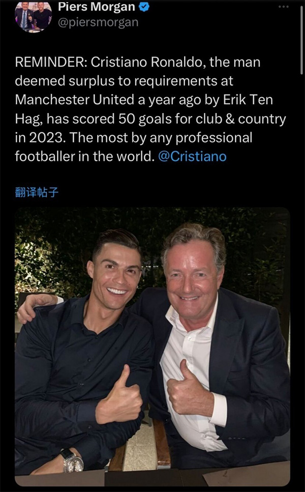 在曼联出局后,知名C罗、阿森纳球迷、英国名嘴皮尔斯-摩根又嗨了。他第一时间发文,嘲讽滕哈格的同时,再次为C罗“打抱不平”。摩根晒出自己和C罗的合照,并写道:“提醒一下,一年前,滕哈赫认为C罗是曼联累赘(surplus)的球员。2023年,他已经为俱乐部和国家队打进了50粒进球,这是世界上所有职业球员里今年进球最多的人。”