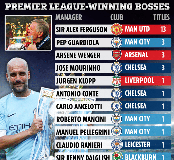 JRS直播网讯 曼城夺冠了,球队的主帅瓜迪奥拉第三次带领球队拿到了英超冠军,所有的曼城球迷都感到非常兴奋,而且球队还进入了欧冠决赛,曼城还有希望拿到梦寐以求的欧冠冠军,许多曼城球迷都在称赞瓜迪奥拉。那么,瓜迪奥拉拿到的三个英超冠军,在英超历史上可以排名第几呢?近日,就有媒体给出了英超冠军主帅的排名,何谓冠军主帅,就是你带队拿到英超冠军的次数。
