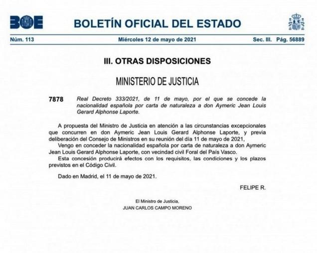 JRS直播网讯 北京时间5月12日,来自西班牙国家政府公报(BOE)的消息,根据2021年第333号法令,效力于曼城的巨星中卫拉波尔特,正式被授予西班牙国籍,届时有望代表斗牛士军团出战欧洲杯。