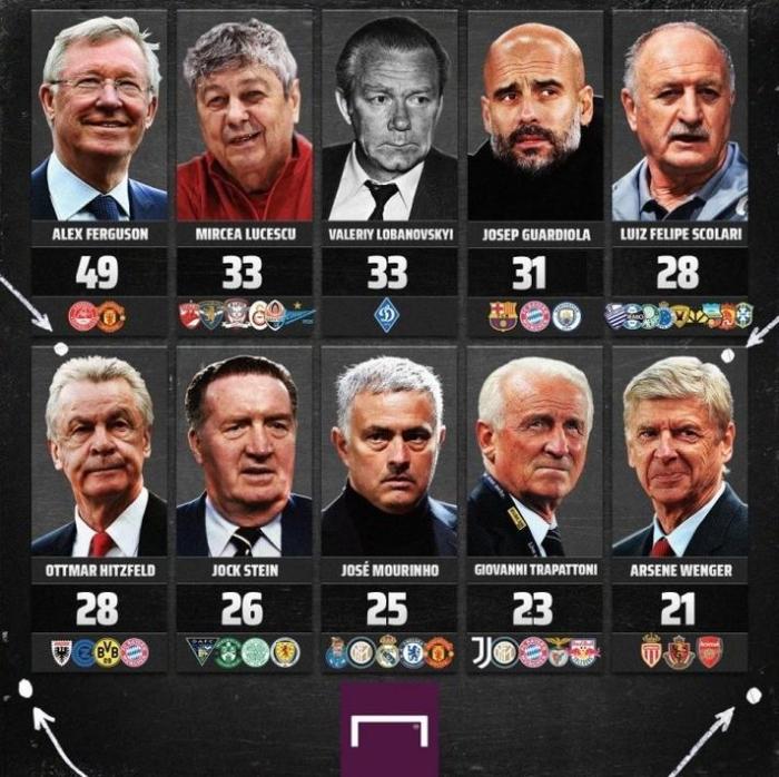 JRS直播网讯进球网统计主教练冠军数,弗格森49冠高居榜首,瓜迪奥拉31冠排第四,穆里尼奥25冠第八,温格21冠第十。