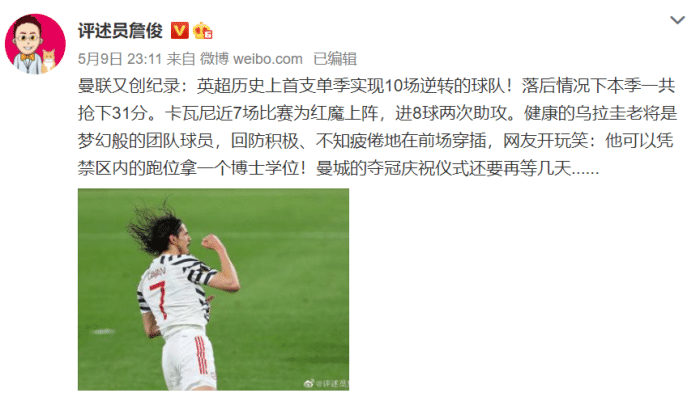 詹俊写道:“曼联又创纪录:英超历史上首支单季实现10场逆转的球队!落后情况下本季一共抢下31分。卡瓦尼近7场比赛为红魔上阵,进8球两次助攻。健康的乌拉圭老将是梦幻般的团队球员,回防积极、不知疲倦地在前场穿插,网友开玩笑:他可以凭禁区内的跑位拿一个博士学位!曼城的夺冠庆祝仪式还要再等几天...... ”