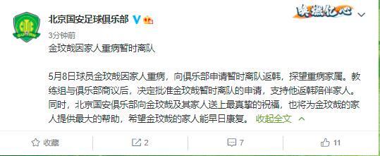 JRS直播网讯 北京时间5月8日,北京国安官方宣布,金玟哉因家人重病暂时离队。
