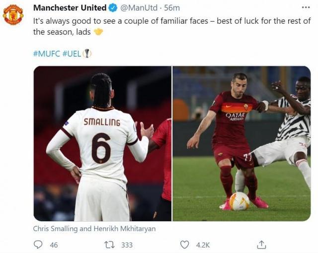 JRS直播网讯 北京时间今天凌晨,曼联在欧联杯半决赛2-3不敌罗马,总比分8-5晋级决。罗马的斯莫林和姆希塔良都曾效力于曼联,赛后曼联官推发文祝福斯莫林和姆希塔良,并希望他们在赛季剩余的比赛里一切顺利。