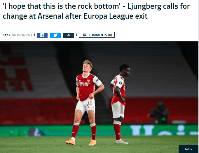 JRS直播网讯 北京时间5月7日,欧联半决赛次回合阿森纳0-0战平比利亚雷亚尔,总比分1-2遭到淘汰无缘决赛。前阿森纳临时主帅、BT体育评论员永贝里希望阿森纳现在已经触底,接下来可以反弹了。