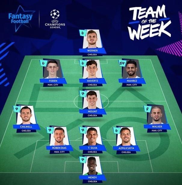 JRS直播网讯 坎特在击败皇马的比赛中创造两粒进球,当选全场最佳球员,不过他没有入选本周最佳阵容。这11人都来自获胜的两支球队切尔西和曼城。