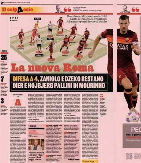《米兰体育报》还曝光了穆帅下赛季执教罗马的主打阵型,那就是用4-2-3-1的阵型,这也是他最近几年常用的阵型。而意大利国脚扎尼奥洛,将会在穆帅麾下得到重用。下赛季罗马潜在的主力阵为门将穆索,左右边卫分别为卡斯多尔普、斯皮纳佐拉,中卫组合为戴尔、小曼奇尼;双后腰是霍伊别尔和韦勒图;三个前卫是扎尼奥洛、佩莱格里尼、姆希塔良,中锋为哲科(卡洛斯-维尼修斯)。