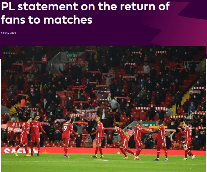 主场球迷预计能在5月17日入场观战,而政府在5月10日之前将公开宣布计划中的第三步管控措施的最终决定。