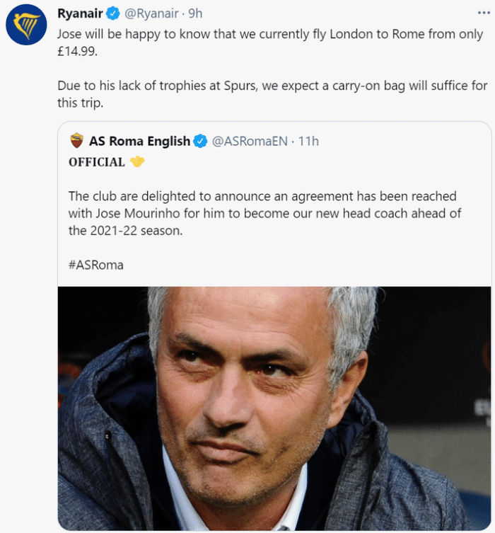 昨天,罗马官宣穆里尼奥将从下赛季起执教球队,这家航空公司随后写道:“我们从伦敦飞往罗马的最低票价仅14.99英镑,穆帅知道了肯定会高兴。”