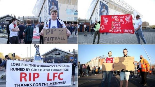 据记者詹姆斯-皮尔斯报道,有数百名球迷在埃兰路球场外抗议,他们拉起了写有“利物浦安息”、“足球安息”、“贪婪和腐败毁了工人阶级足球”等字样的横幅,并高喊“去他x的超级联赛”,同时将参与创造欧超联赛的英超BIG6称为“六个贪婪的杂种。