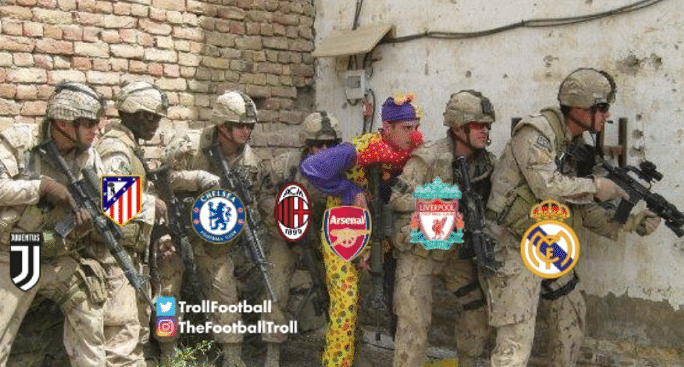 不少网友看到超级联赛的12队名单之后开始恶搞,在有欧冠奖杯的皇马、巴萨、利物浦和AC米兰的身边,阿森纳就像是一个小丑一样,其他的球队都是装备精良的大兵,言下之意就是阿森纳有些滥竽充数。