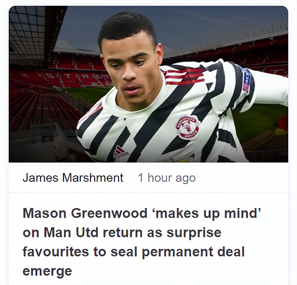 JRS直播网12月07日22岁的英格兰射手梅森·格林伍德被曝已经排除了重返曼联的可能性,在租借到赫塔菲的一年期限届满后,他希望永久转会加盟该队,或者前往其他球队效力,远离老特拉福德的是非之地。