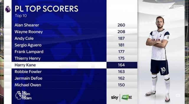 据天空体育统计,此役过后凯恩已经在英超打进164粒进球,升至英超历史射手榜第七位。排在他身前的包括亨利(175)、兰帕德(177)、阿圭罗(181)、安迪-科尔(187)、鲁尼(208)、阿兰-希勒(260)。另外,凯恩的164粒进球中有86粒是客场攻入的,客场进球数量仅次于鲁尼(94)和希勒(87)。