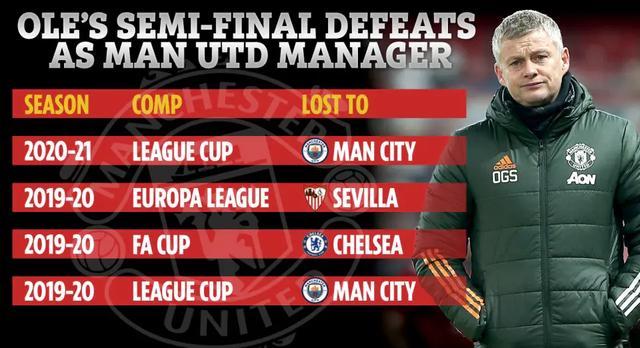 自从成为曼联主帅之后,索尔斯克亚已经带领球队五次杀入杯赛半决赛,但此前四次都无法更进一步。
