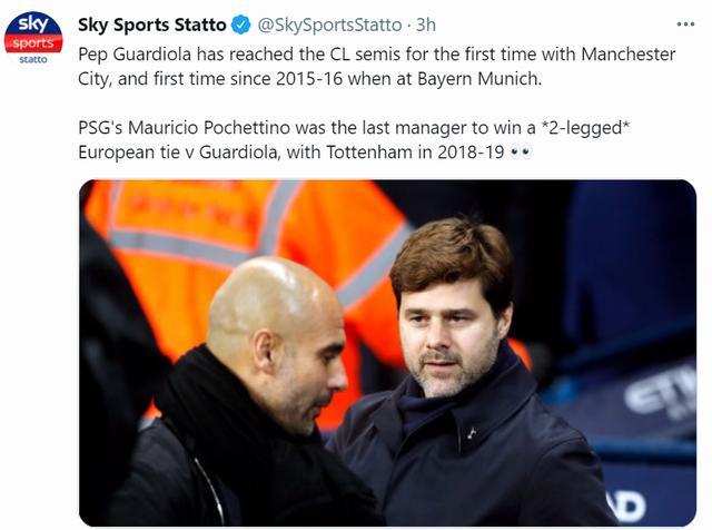 JRS直播网4月15日讯根据数据统计,瓜迪奥拉首次作为曼城主帅进入欧冠四强,球队接下来将在半决赛中遭遇巴黎,而上一位在欧冠两回合比赛中击败瓜迪奥拉的人正是现任巴黎主帅波切蒂诺。