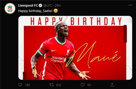 JRS直播网讯2021年4月10日,利物浦前锋马内迎来29岁的生日,俱乐部官方在社交媒体上为其送上祝福。